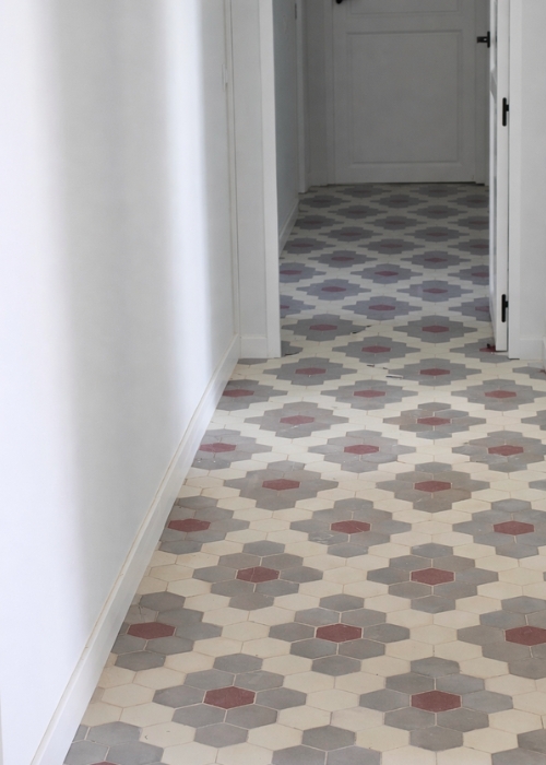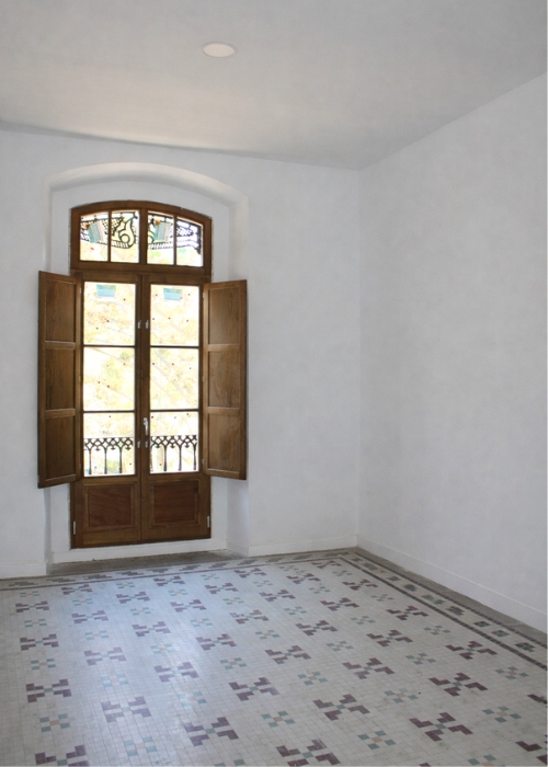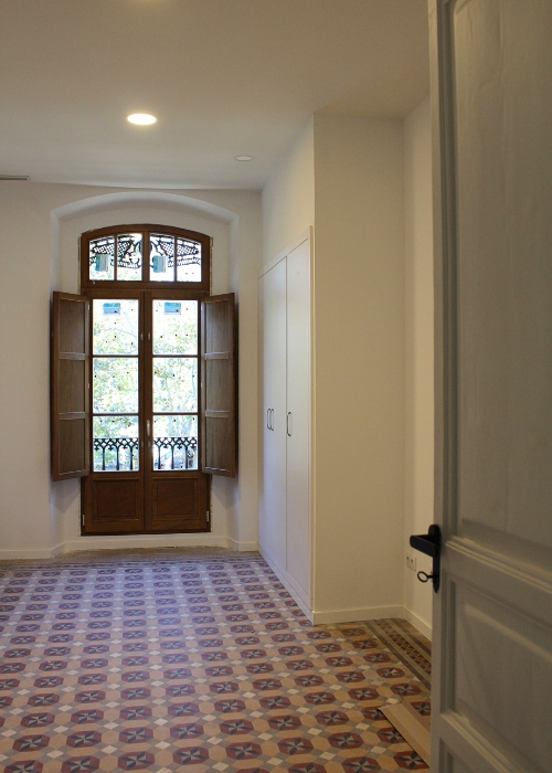 Uno de los ejes del proyecto Alameda ha sido la puesta en valor de los elementos originales de la vivienda, especialmente los suelos hidráulicos del salón y los pasillos, que se han mantenido y restaurado mediante un proceso de limpieza y pulido. En esta misma línea, se han conservado y restaurado las contraventanas interiores originales en acabado blanco, integrándolas en la nueva propuesta y manteniendo la identidad de la vivienda.