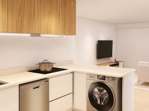 Entre los materiales predominan el porcelánico rectificado en suelos y baños. La madera en tonos naturales y las lacas en blanco mate. El conjunto crea una estética cálida, funcional y atemporal, donde cada elemento está pensado para durar y aportar valor.